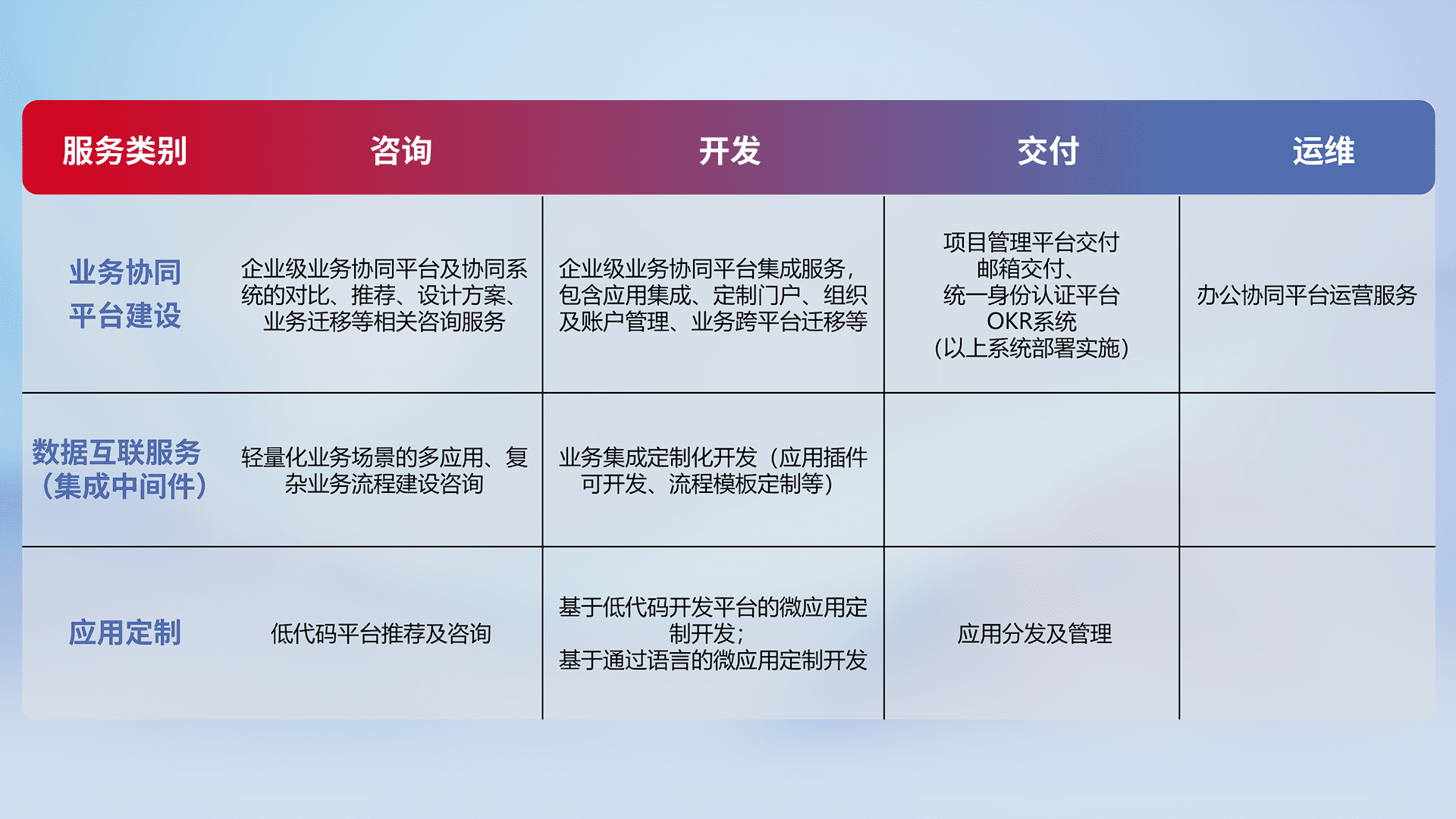 针对钉钉、、企微、、、、IDaas等平台级产品提供产品的规划、、方案、、、交付、、定制化开发等服务,,,实现如统一协同办公、、智能客户服务、、、混合会议管理、、、、智能数据查询、、、、等业务场景,,,,实现数字化转型。。